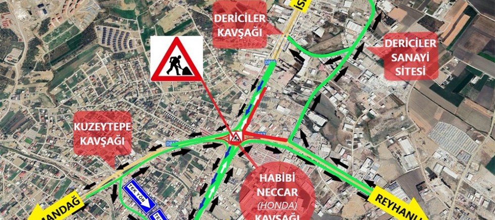 Reyhanlı istikametinden Antakya ve Samandağ istikametine seyahat edecek sürücüler, kavşağa yetişmeden Dericiler Sitesi güzergâhını kullanıp Dericiler Sitesi Kavşağı’ndan dönerek İskenderun istikametine veya Habibi Neccar Kavşağı alt geçidini kullanarak Antakya istikametine, kavşaktaki bağlantı yolunu kullanarak da Samandağ istikametine seyahatlerini sürdürebilecekler.