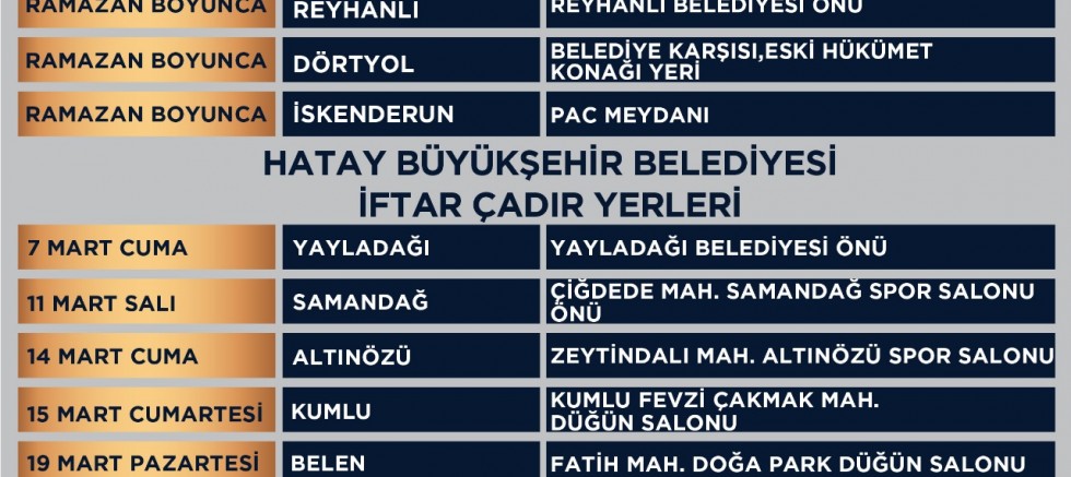 Ayrıca 7 Mart Cuma günü Yayladağı Belediyesi Önü, 11 Mart Salı Günü Samandağ Spor Salonu, 14 Mart Cuma Altınözü Spor Salonu, 15 Mart Cumartesi Kumlu Fevzi Çakmak Mahallesi Düğün Salonu, 17 Mart Pazartesi Belen Fatih Mahallesi Doğa Park Düğün Salonu, 20 Mart Perşembe Hassa Girne Mahallesi Spor Salonu, 21 Mart Cuma Erzin Hürriyet Mahallesi Spor Salonu, 22 Mart Cumartesi Payas Sokullu Mehmet Paşa Külliyesi, 24 Mart Pazartesi Arsuz Konacık Mahallesi ve 29 Mart Cumartesi Defne ilçesinde bulunan EXPO Çadır’ında kuracağı iftar sofraları ile iftarlarını yapmak isteyen vatandaşlara sıcak yemek verecek.