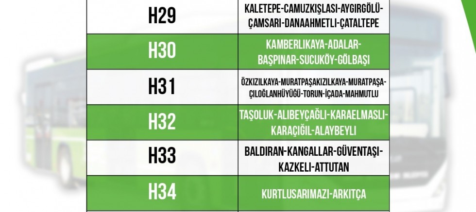 Devreye alınan yeni hatlardan H28 Narlıhopur-Kamışlar-Söğütlüöz-Karamankaşı-Güzelce, H29 Kaletepe-Camuzkışlası-Aygırgölü-Çamsarı-Danaahmetli-Çataltepe, H30 Kamberlikaya-Adalar-Başpınar-Sucuköy-Gölbaşı, H31 Özkızılkaya-Muratpaşakızılkaya-Muratpaşa-Çiloğlanhüyüğü-Torun-İçada-Mahmutlu, H32 Taşoluk-Alibeyçağlı-Karaelmaslı-Karaçağıl-Alaybeyli, H33 Baldıran-Kangallar-Güventaşı-Kazkeli-Attutan, H34 Kurtlusarımazı-Arkıtça, H35 Arpalı-Kodalı-Karamağara-Ilıkpınar, H36 Topboğazı-Özsoğuksu Mahalleleri arasında sefer yaparak vatandaşlara hizmet vermeye başladı.